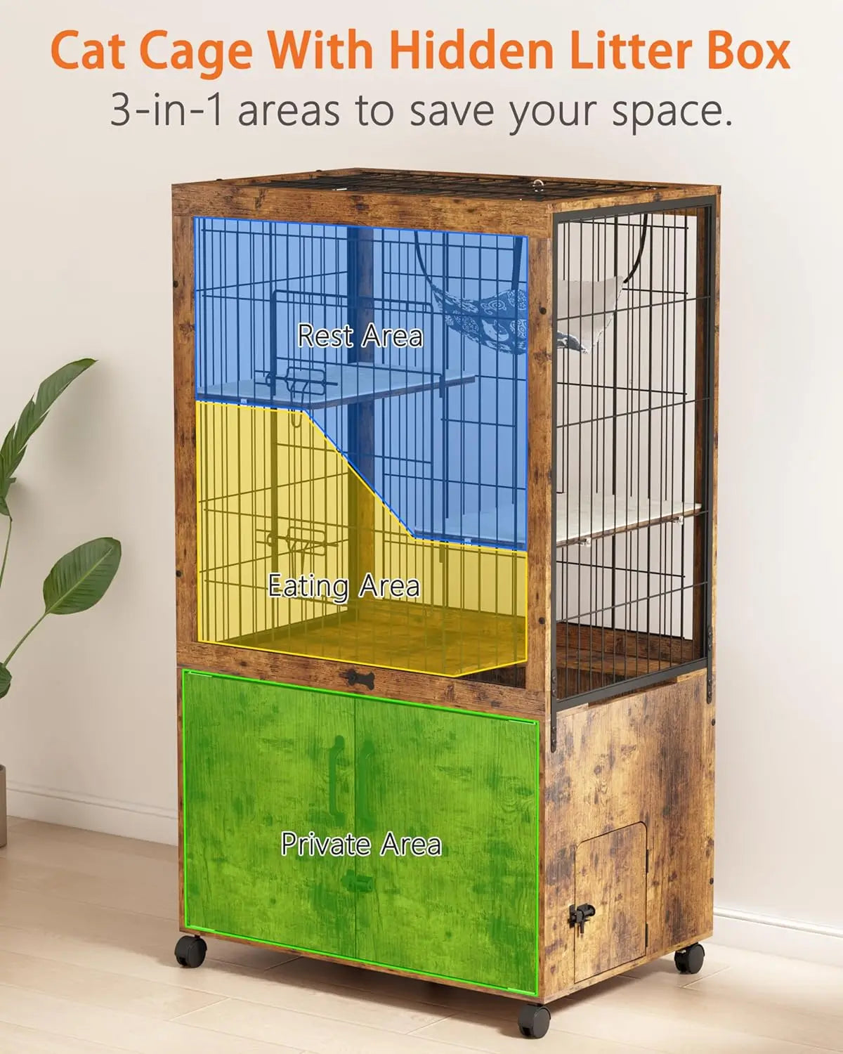 - Thoughtful multi-level layout: the bottom floor is your hidden litter area, the second level serves as a dining zone with bowls, plus two perches and an adjustable hammock.